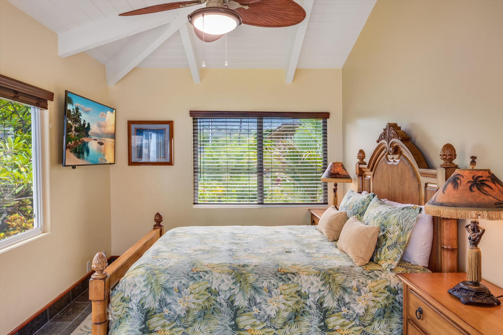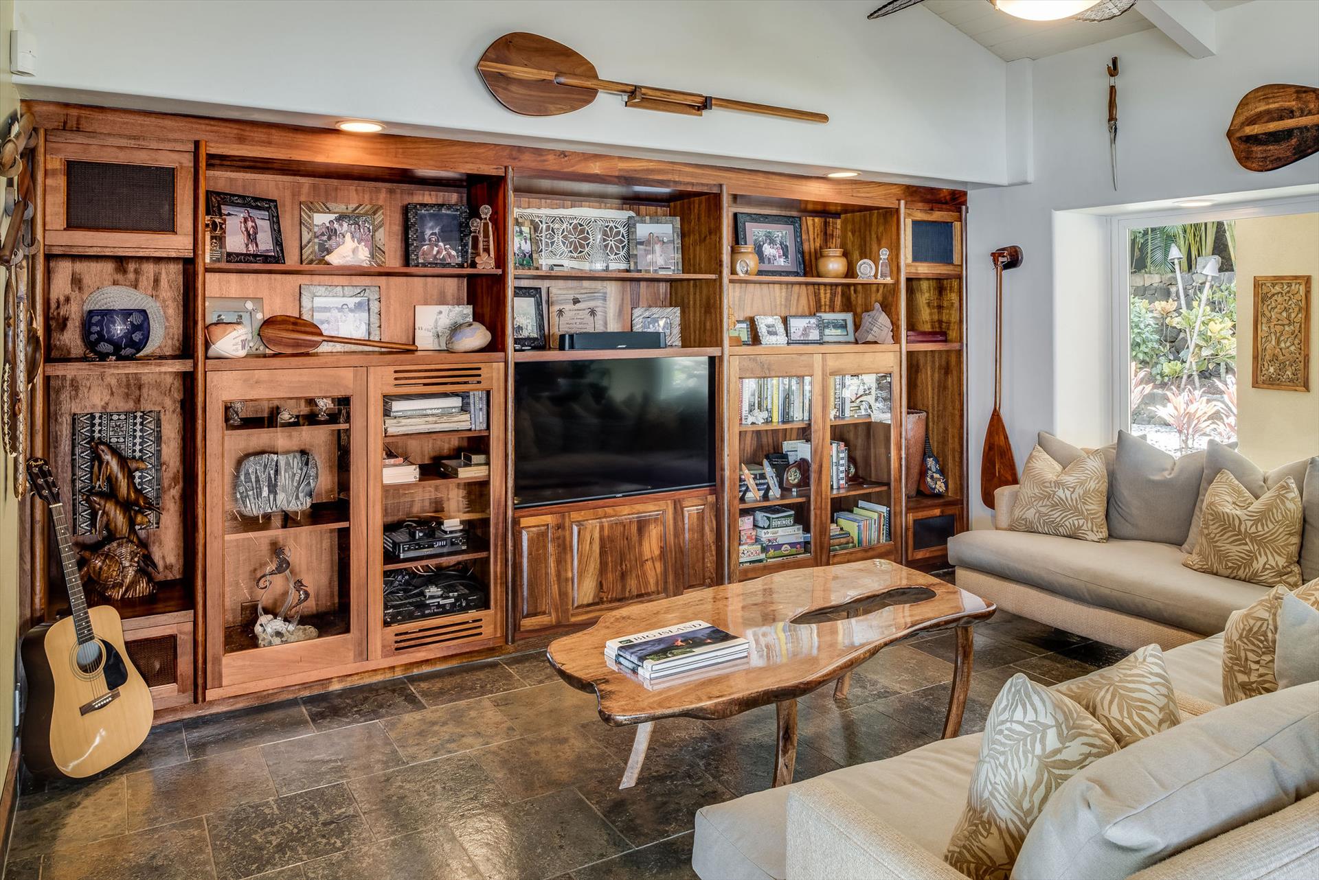 The main entrance to the Lucky Bennet designed home is composed of spectacular koi ponds. The bedrooms are furnished with Tommy Bahama Lexington furniture, two Kings, three Queens, and a room with two twin beds. Kitchen is composed of stainless-steel sub-zero refrigerator, Wolf oven, microwave, wine fridge, dishwasher and glass electric cooktop. Slate floors in all common areas and bedrooms. We have an amenity garage area with snorkeling gear, beach chairs, beach umbrellas, boogie boards, surf boards, and many beach coolers.